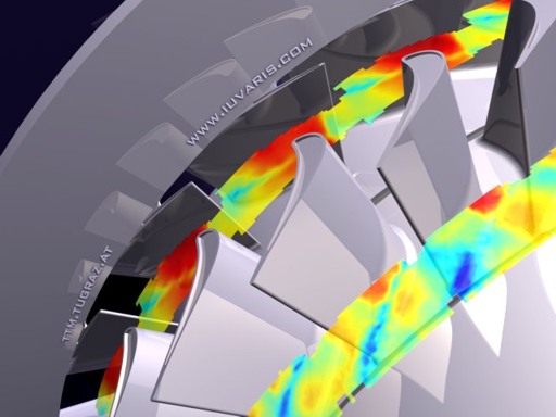 Animation zur räumlich und zeitlichen Veranschaulichung von Strömungsparametern in einer Überschall-Turbinenstufe.